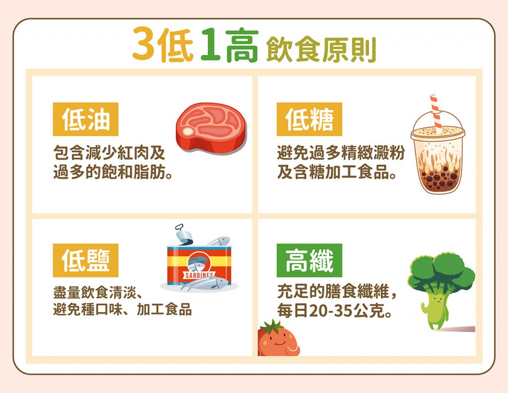 運用「三低一高」健康飲食口訣(低油、低糖、低鹽、高纖)