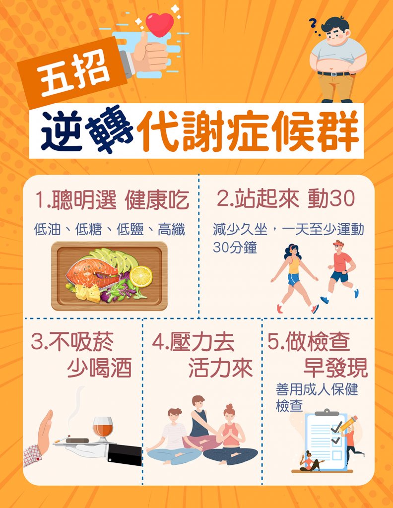 大家記好上述三低一高的飲食原則,以及逆轉4招了嗎?只要保持健康飲食及規律運動的習慣,每天定時測量腰圍及血壓,定期健檢(量測血糖和血脂)。就算符合代謝症候群三個指標以上,也能夠有機會「逆轉代謝,重拾健康」,享受樂齡的活力人生!
