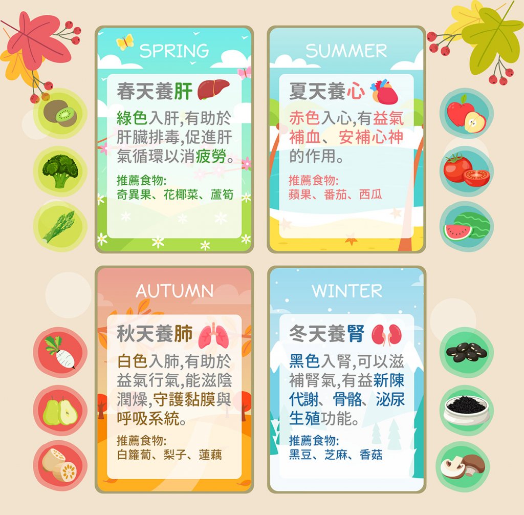 依照四季補充相對應的需要食材,春天就要多吃綠色的食物養肝,如花椰菜、四季豆,夏天要多吃紅色的食物護心,例如蘋果、番茄,秋天要多吃白色的食物潤肺,例如山藥、水梨,冬天就要多吃黑色的食物補腎,例如黑芝麻、黑豆等。