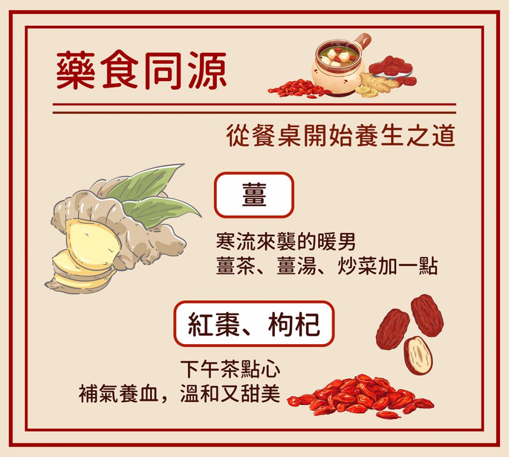 中國幾千年來的養生智慧,就是從餐桌上演變而來的調養概念,例如紅棗、枸杞,無論泡茶或燉湯,都可以幫助養生補氣、溫潤調理;而老薑中的薑辣素則能促進循環,幫助暖身,例如薑母鴨、麻油雞就是加了老薑的藥膳湯,在寒冬中無論來碗雞湯或薑茶,都可以祛寒暖身,滋補養氣。