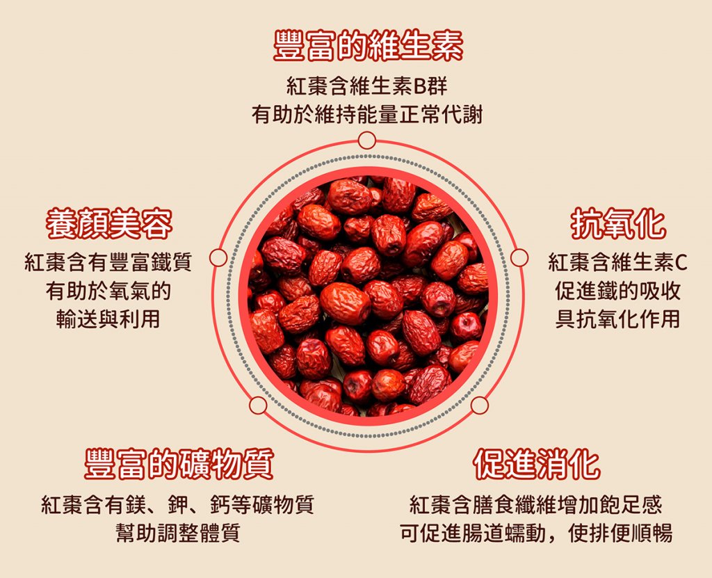 豐富維生素:紅棗含豐富的維生素B群,如維生素B1、維生素B2、菸鹼素等,有助於能量正常代謝,維生素C有助於抗氧化,可幫助鐵質吸收。