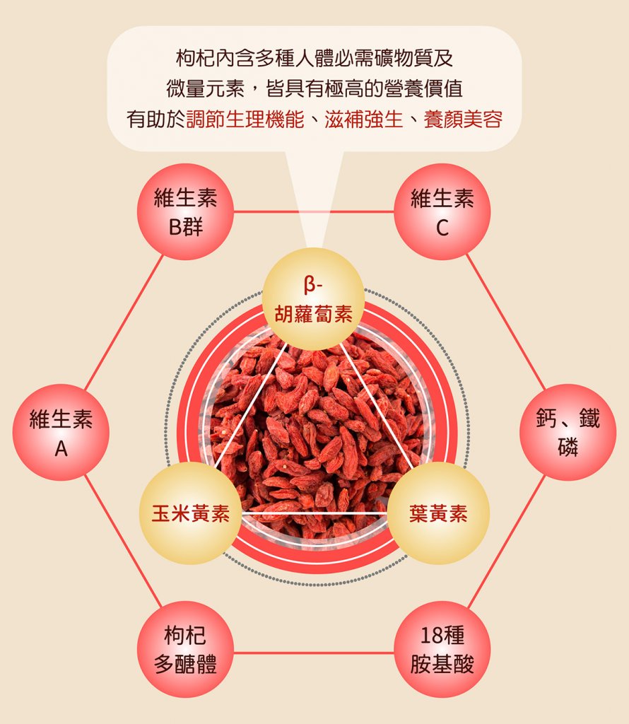 枸杞多醣:以前常聽說靈芝的好壞,就看它多醣體的多寡,枸杞含有枸杞多醣,可以幫助人體增加保護力,在冬天這種寒冷的季節,特別需要補充。